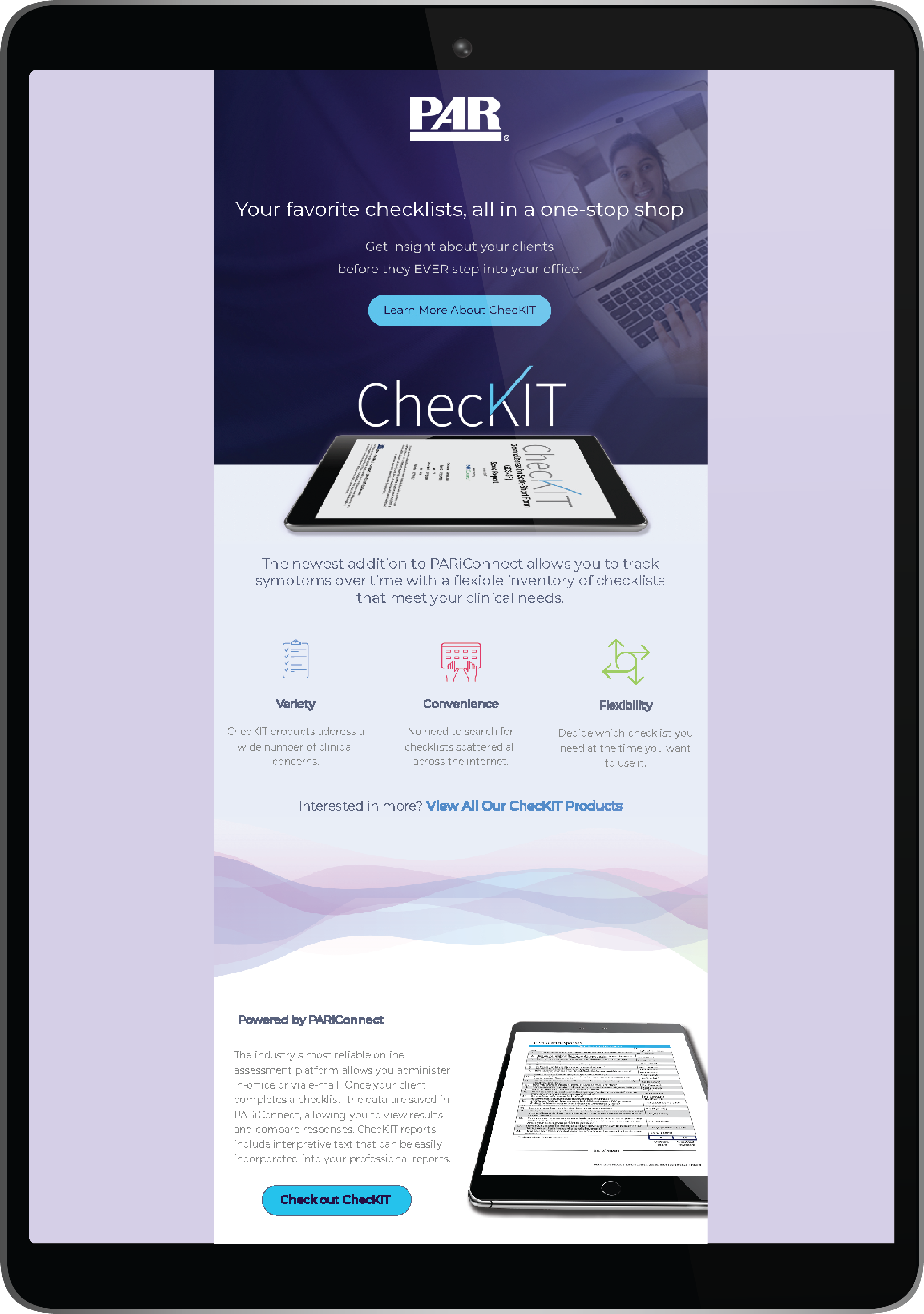 ChecKITUsers can select from a variety of checklists, all in one location, that can be used to track client symptoms across sessions. < Trails-X PSI-4 >